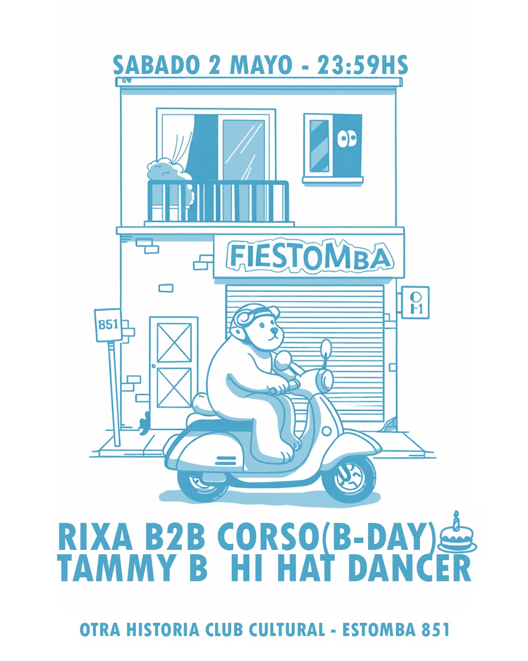 El sábado 2 de mayo vuelve la Fiestomba al club con un line up prendido fuego, lleno de sonidos variados y bailables: HIHATDANCER, Sammy B, Rixa b2b Corso (que cumple años 🎊) traen a la pista un arsenal lleno de house, tech, breaks, ukg y más. Venite que se va a poner buena!