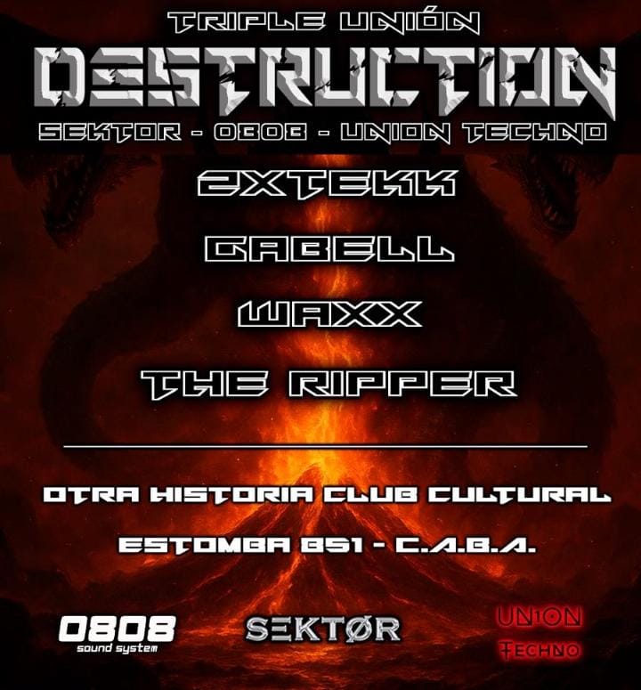 Mortales! 😈 Sean bienvenidxs a DESTRUCTION, una triple unión de tres ciclos para crear una fiesta multi-género (Tekno - Hardtechno - Hardcore) y mucho más para deleitar sus oídos y dejarlos sin piernas. Cada ciclo será representado por sus DJs residentes: • De la mano de - 0808 se presentará: Zxtekk Quien estará haciendo bailar...