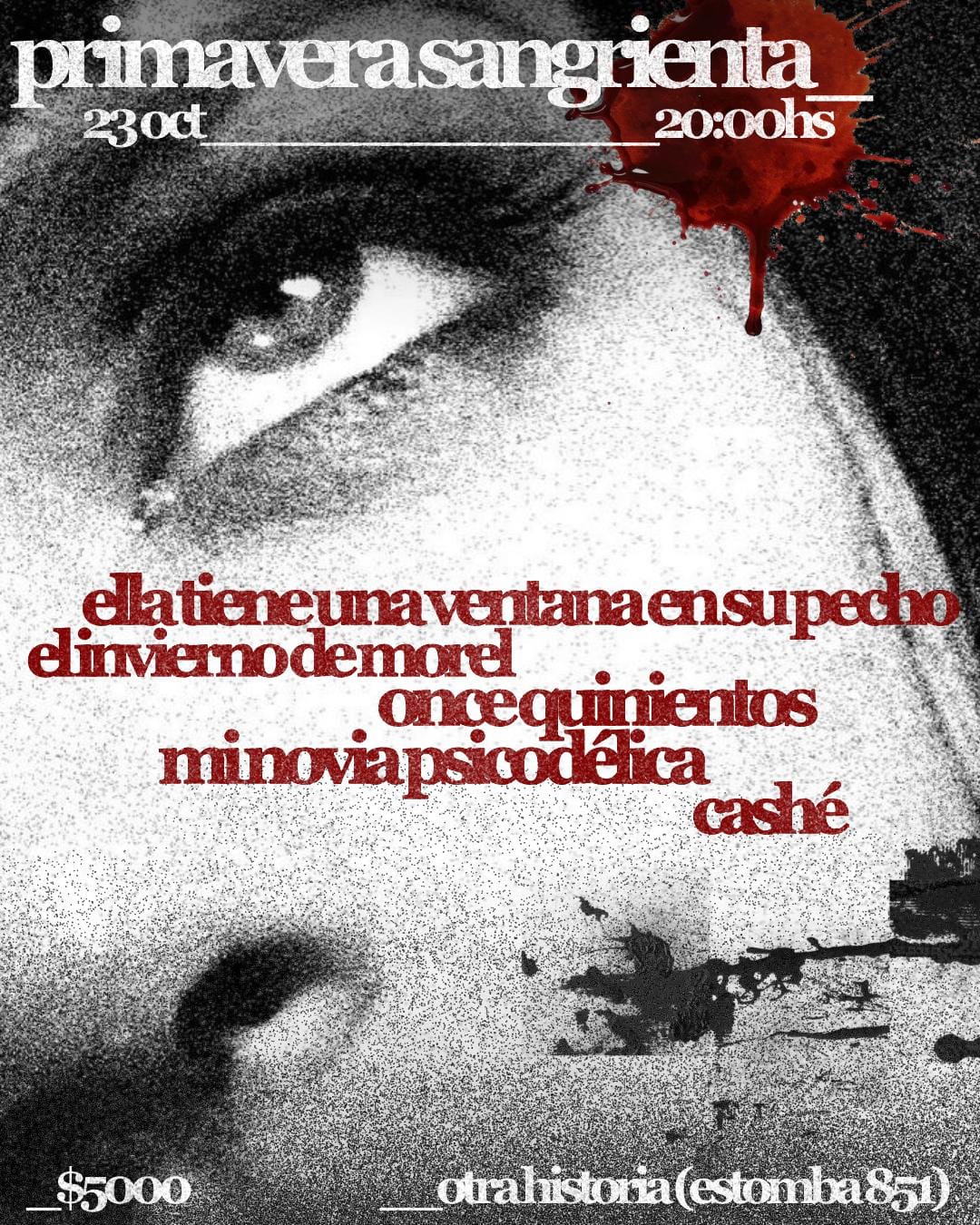 Cinco bandas transformando el aire de octubre. Tocan: Mi novia psicodélica Cashé El invierno de Morel Once Quinientos Ella tiene una ventana en su pecho (cerrando gira de presentación por Buenos Aires) Jueves 23/10 20hs